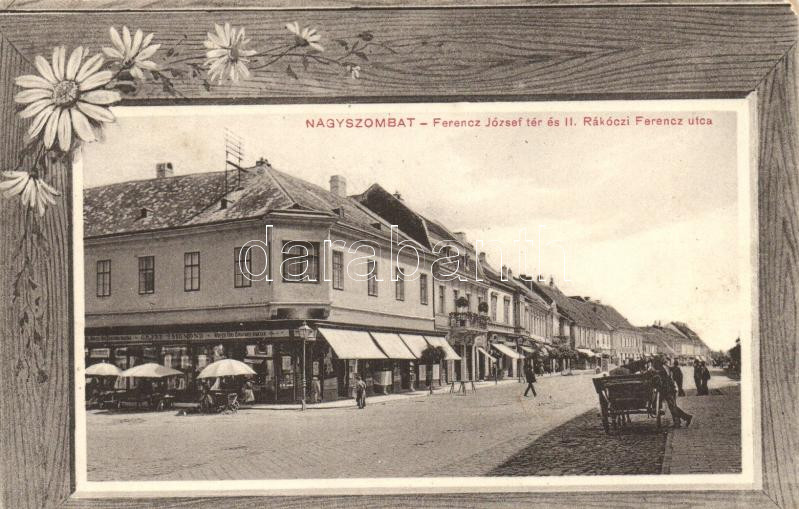 Leírás: Nagyszombat, Trnava; Ferenc József tér, Orosz Zsigmond divatáru raktára / Franz Josef Square, shop; floral frame