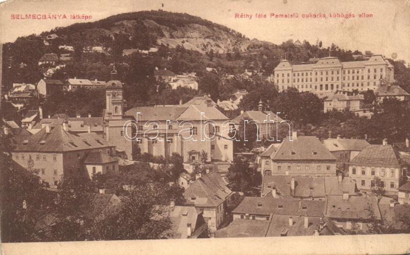 Selmecbánya, Banská Stiavnica; látkép a Bányás- és Erdészeti akadémiák épületeivel. Réthy-féle Pemetefű cukorka reklámmal / view with academic building (fa)