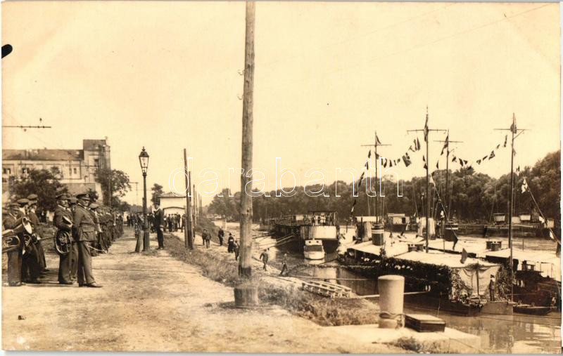 A Dunai Flotilla feldíszített őrnaszádjai ünnepségen az Óbudai hajógyár előtt. Emke Fotószalon / Donau-Flotille / Decorated Hungarian river guard ships at the ceremony, photo