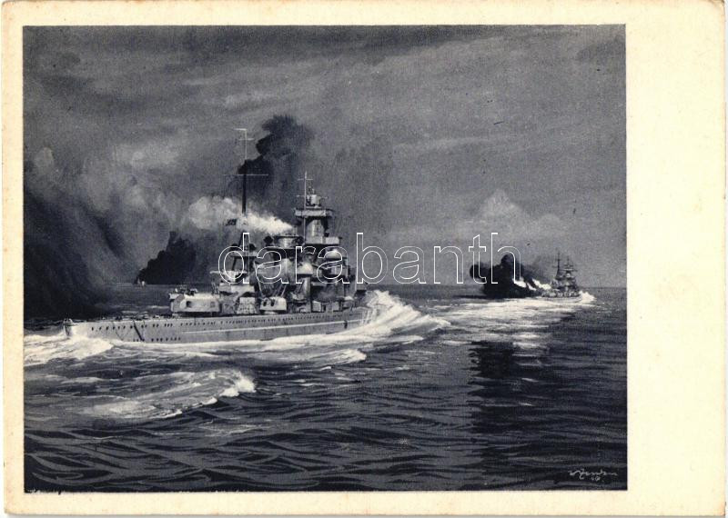 Leírás: Le "Scharnhorst" et le "Gneisenau" aux prises avec le "Glorious" / WWII military, German-British naval battle, battle ships, artist signed (EK)