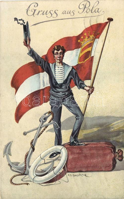 Pola, Mariner with the Austrian Naval flag, litho, s: Ed Dworak https://www.darabanth.com/hu/262-Gyorsarveres/262.0/Kepeslapok/Hadihajo~100076/Pola-Mariner-with-the-Austrian-Naval-flag-litho-s-Ed-Dworak~II1303779
