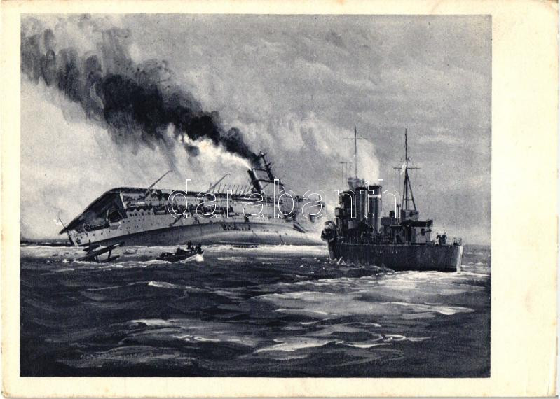 Un sous-marin allemand coule le porte-avions britannique "Courageous" / WWII military, German-British naval battle, British aircraft carrier "Courageous" sinking by a German submarine (EK)