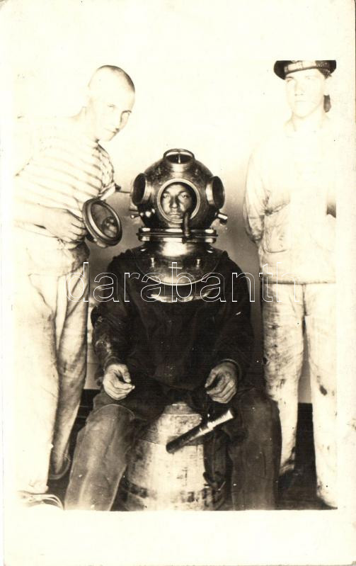 Leírás: cca. 1912-1918 Búvár, a háttérben az SMS Viribus Unitis matróza / Diver, behind him a mariner from the SMS Viribus Unitis, photo (EK)