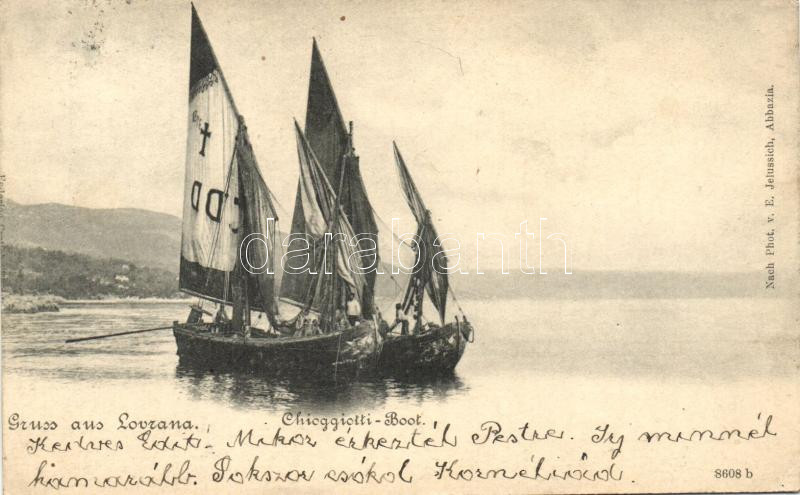 Lovran, Lovrana; Chioggiotti-Boot / sailing ships (EK) https://www.darabanth.com/hu/262-Gyorsarveres/262.0/Kepeslapok/Horvatorszag-Delvidek~100034/Lovran-Lovrana-Chioggiotti-Boot-sailing-ships-EK~II1304875