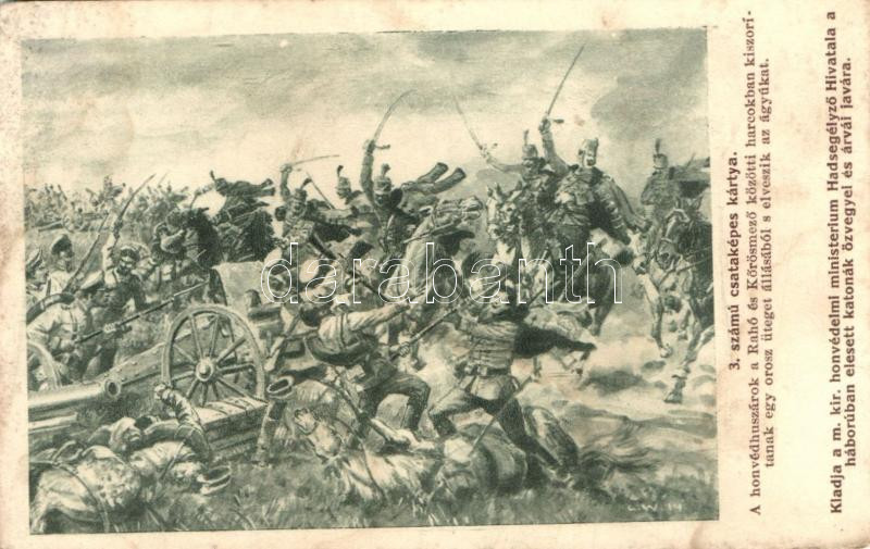 3. számú csataképes kártya; honvédhuszárok a Rahó és Kőrösmező közötti harcokban kiszorítanak egy orosz üteget és elveszik az ágyúkat / WWI K.u.K. military, cannon, artist signed (EK)