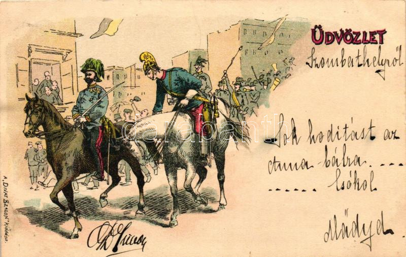 Leírás: Magyar honvéd huszárok; Üdvözlet, a Divat Szalon kiadása / Hungarian hussars 'Grüss aus...' litho (Rb)