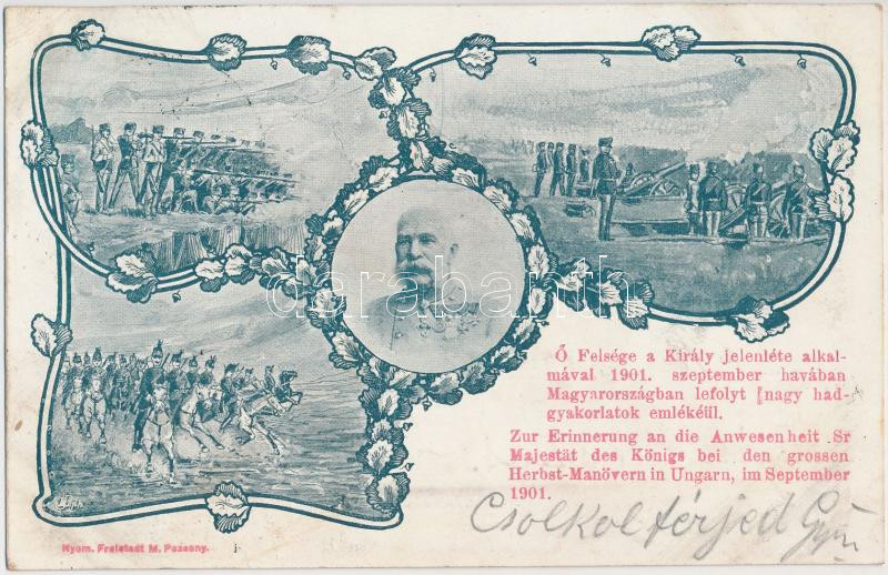 Ő felsége a Király jelenléte alkalmával 1901. szeptember havában Görcsöny és Dolni-Mihojlac mellett lefolyt nagy hadgyakorlatok emlékéül / K.u.K. military, field practice memorial card, Franz Joseph, Art Nouveau floral