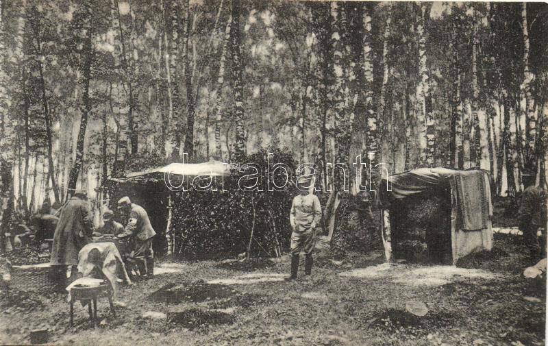 Ostrów, Ezredparancsnokság az erdőben; kiadja a M. kir. 10. honvéd gyalogezred / Regimental Command in the Forest at Ostrow, K.u.K. Army, WWI, published by the 10th Royal Hungarian Infrantry regiment; from postcard booklet