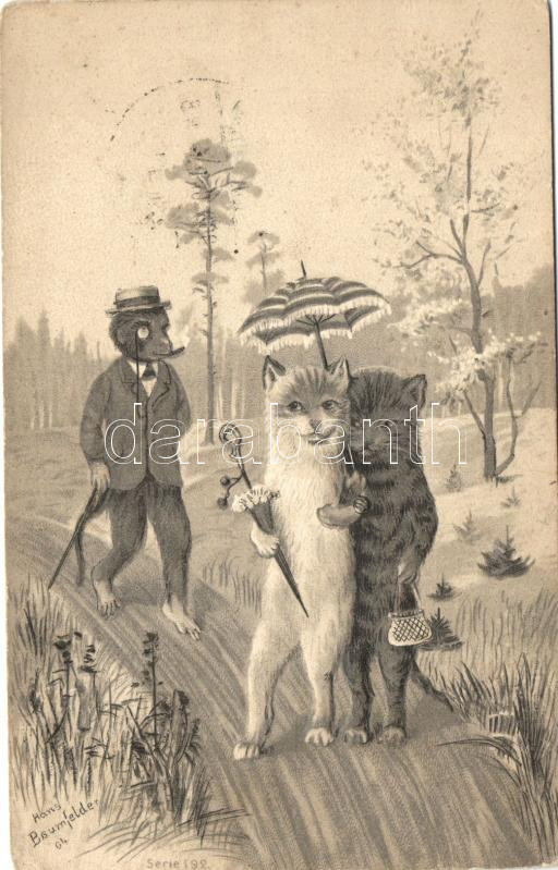 Leírás: Cats and monkey gentleman in suit; Emb., litho, s: Hans Baumfelder (EK)