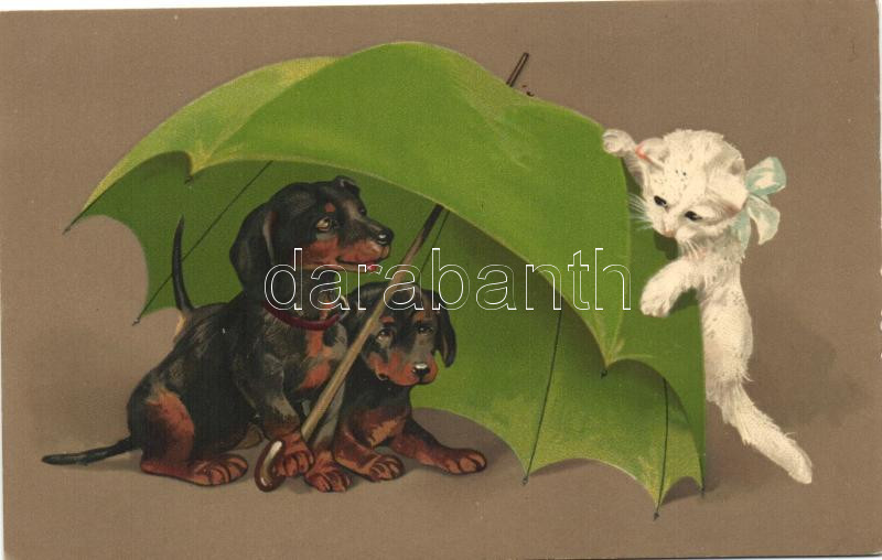Dog puppies under green umbrella with white cat, Meissner & Buch K... https://www.darabanth.com/hu/262-Gyorsarveres/262.0/Kepeslapok/Macska~100090/Dog-puppies-under-green-umbrella-with-white-cat-Meissner-Buch-Kunstlerpostkarten-Serie-1943-li~II1302316