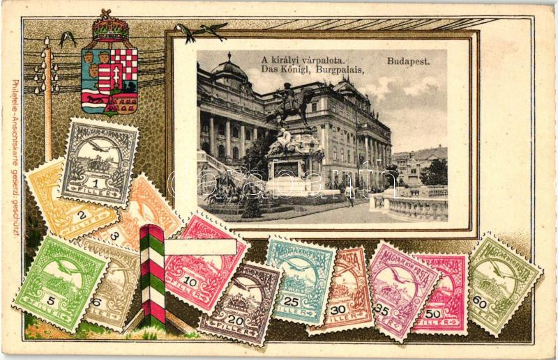 Budapest I. Királyi várpalota, Philatelie-Ansichtskarte, bélyegek, cím... https://www.darabanth.com/hu/262-Gyorsarveres/262.0/Kepeslapok/Magyarorszag~100023/Budapest-I-Kiralyi-varpalota-Philatelie-Ansichtskarte-belyegek-cimer-litho-EK~II1282724