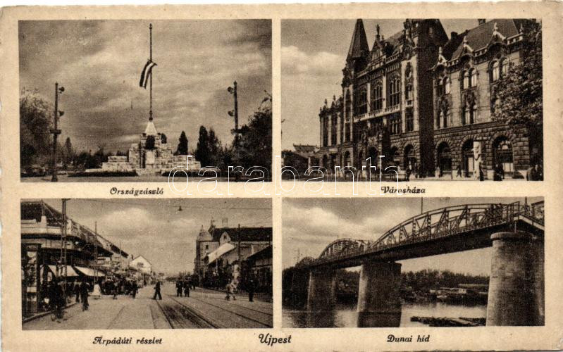 Budapest IV. Újpest; országzászló, városháza, Árpád út, Duna híd https://www.darabanth.com/hu/262-Gyorsarveres/262.0/Kepeslapok/Magyarorszag~100023/Budapest-IV-Ujpest-orszagzaszlo-varoshaza-Arpad-ut-Duna-hid~II1263284