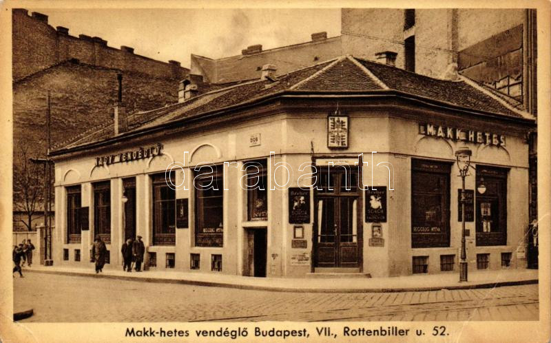 Budapest VII. Makk-hetes vendéglő; Rottenbiller u. 52. (EB) https://www.darabanth.com/hu/262-Gyorsarveres/262.0/Kepeslapok/Magyarorszag~100023/Budapest-VII-Makk-hetes-vendeglo-Rottenbiller-u-52-EB~II1298056