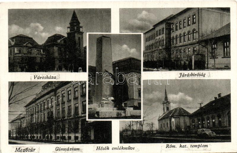 Leírás: Mezőtúr, városháza, járásbíróság, gimnázium, Hősök emlékműve
