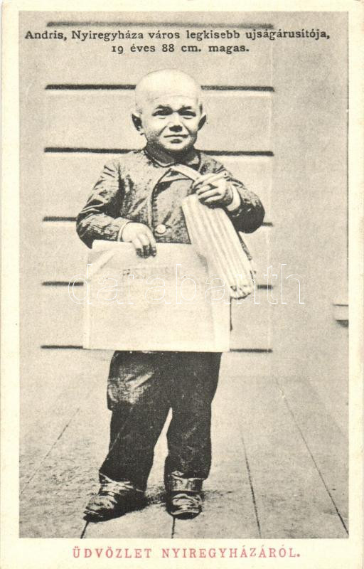 Nyíregyháza, Andris a város legkisebb újságárusítója, 19 éves, 88 cm m... https://www.darabanth.com/hu/262-Gyorsarveres/262.0/Kepeslapok/Magyarorszag~100023/Nyiregyhaza-Andris-a-varos-legkisebb-ujsagarusitoja-19-eves-88-cm-magas-Kiadja-Klein-A~II1301143