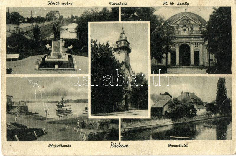 Leírás: Ráckeve; Hősök szobra, Városháza, M. kir. kastély, Hajóállomás, Dunarészlet (fa)