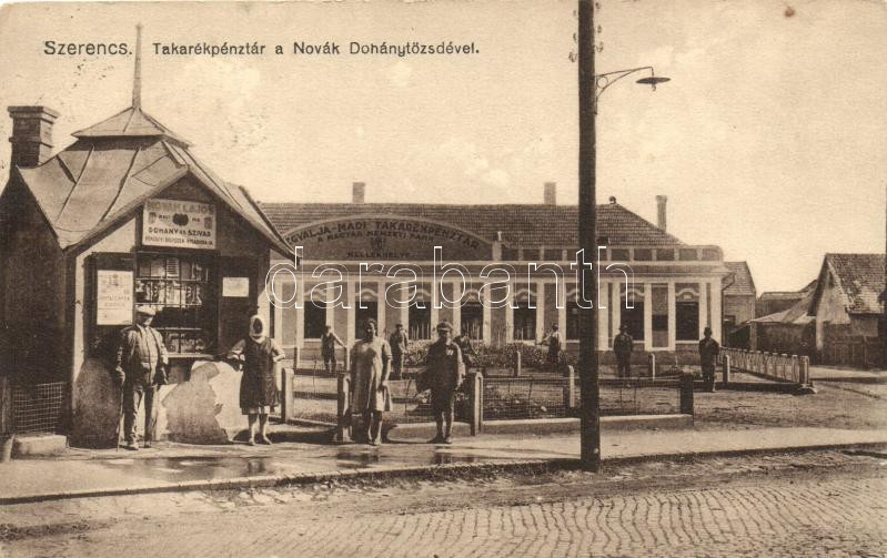 Leírás: Szerencs, Hegyalja-Mádi Takarékpénztár a Novák dohánytőzsdével, Novák Lajos kiadása (kis szakadás / small tear)