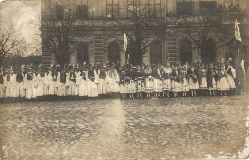 Leírás: cca. 1915 Békéscsaba, városháza, hölgyek és férfiak népviseletben, folklór (fa)