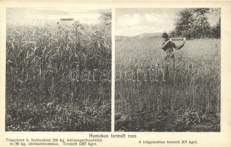 Homokon termelt rozs, trágyázatlan és trágyázott termőföld, szuperfoszfát reklám, mezőgazdasági propaganda lap / Agricultural propaganda card, superphosphate advertisement, rye production