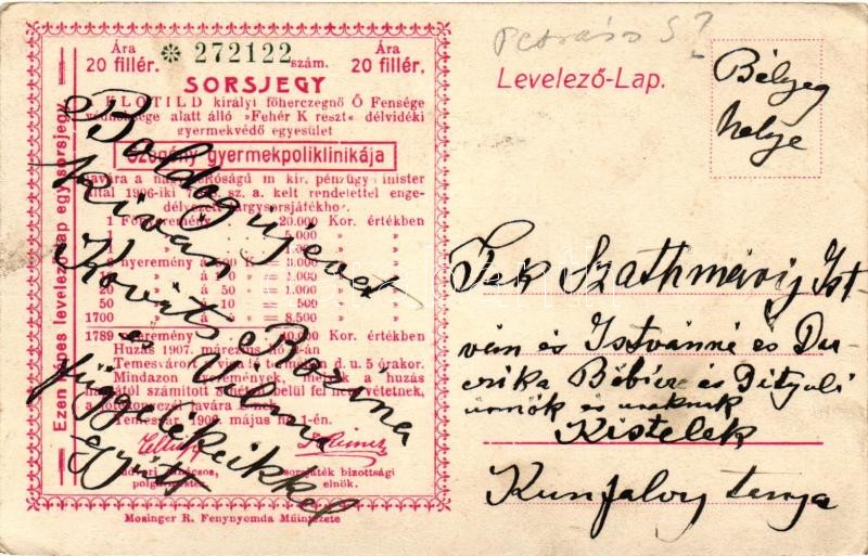 Leírás: Petráss Sári, hátoldalon sorsjegy Szegény gyermekpoliklinika javára / charity lottery ticket on the backside (EK)