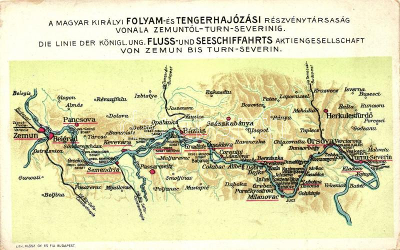 A Magyar Királyi Folyam- és Tengerhajózási Részvénytársaság vonala Zemuntól-Turn-Severinig; Klösz György és fia / Map of The Royal Hungarian River and Sea Shipping Lines Company, litho (EK)