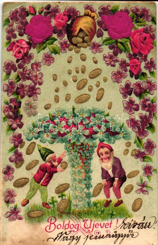 Leírás: 'Boldog újévet!' / New Year, dwarves, coins, flowers, mushroom, silk card, Emb., litho (vágott / cut)