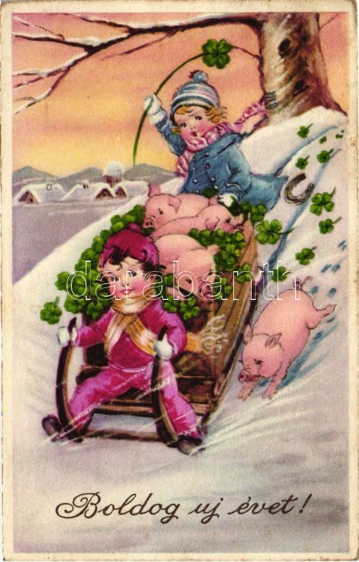 New Year, sledging children with pigs, clover, EAS 6714. (EK) https://www.darabanth.com/hu/262-Gyorsarveres/262.0/Kepeslapok/Udvozlolapok-Unnepek~100103/New-Year-sledging-children-with-pigs-clover-EAS-6714-EK~II1016600