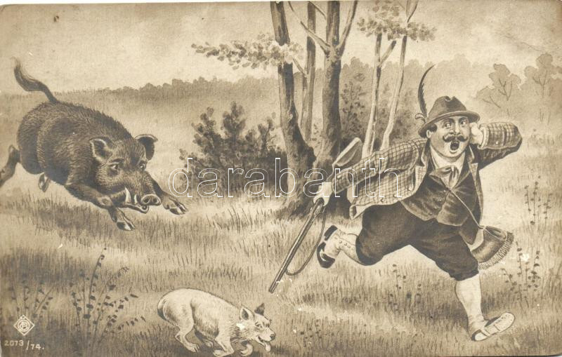 Boar chasing a hunter and his dog, humour (fl) https://www.darabanth.com/hu/262-Gyorsarveres/262.0/Kepeslapok/Vadasz~100104/Boar-chasing-a-hunter-and-his-dog-humour-fl~II1303786