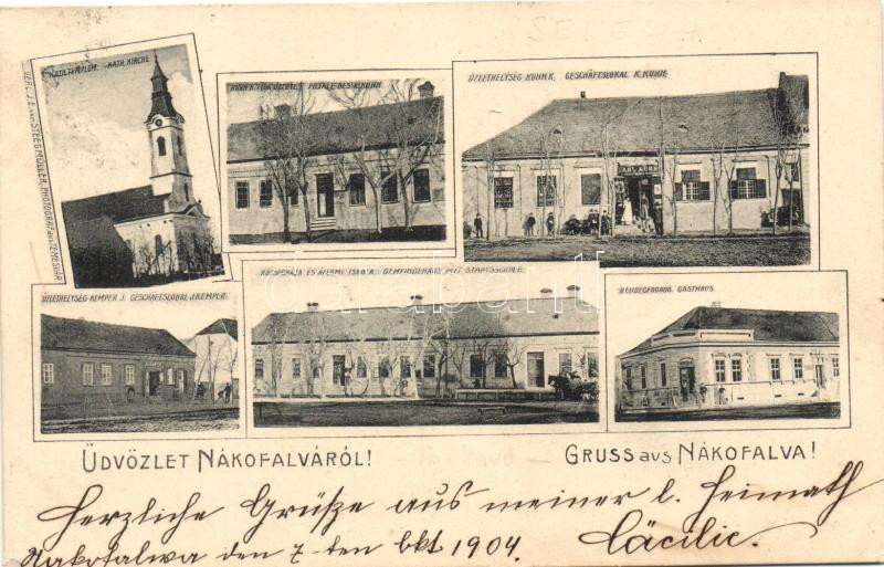 Nákofalva, Nakovo; Karl Kuhn üzletei, Kemper J. üzlete, Községháza és Állami iskola, Vendégfogadó, templom / shop of Karl Kuhn, shop of Kemper J., town hall and school, hotel, church (EK)