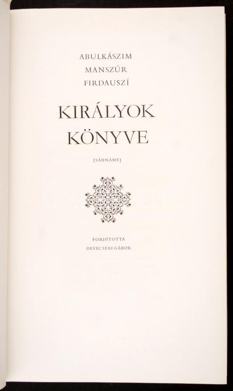 Leírás: Firdauszí: Királyok könyve (Sáhnáme). Fordította: Devecseri Gábor. Bp., 1979, Magyar Helikon. Kiadói aranyozott egészvászon-kötésben.