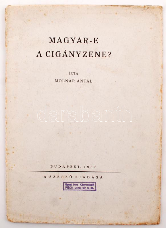 Molnár Antal: Magyar-e a cigányzene? Bp., 1937, szerzői kiadás. 19p. N... https://www.darabanth.com/hu/262-Gyorsarveres/262.0/Konyvek/Konyvek-Egyeb-ritkasagok~45/Molnar-Antal-Magyar-e-a-ciganyzene-Bp-1937-szerzoi-kiadas-19p-Nyomtatta-Kner-Izidor-kony~II1084798