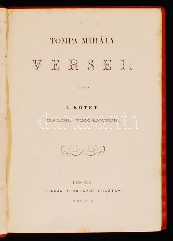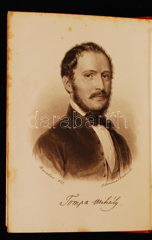 Tompa Mihály versei. I.-V. kötet (Komplett!) Pesten, 1858. Heckenast Gusztáv. 1. Dalok. Románczok. 231p. és T. acélmetszetű portréja. 2. Dalok. Románczok. VIII. 248 l. 3. Regék. VI. 224 l. 4. Népregék. 2 sztl. lev. 221 l. 1 sztl. lev. 5. Beszélyek. Balladák. 214 l. 1 sztl. lev.