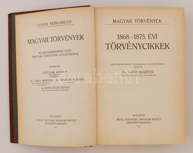 Magyar törvények. (Codex Hungaricus.) Az alkalmazásban levő magyar törvények gyüjteménye. Szerk.: Grecsák Károly vezetésével Lányi Márton-Sándor Aladár-Ráth-Végh István. Bp., 1911. Révai. Az első rész az 1687 és 1910 közötti magyar törvényeket gyűjti össze, összesen 10 kötetben. Ebből 3 kötet (1687-1867, 1889-1893, valamint 1897-1900 évi törvények) hiányzik. Az ezt követő második rész évente kiadásra került a Révai testvérek gondozásában, az 1918-as törvényekig bezárólag. 1919-es törvények híján a harmadik rész már a Térfy Gyula szerkesztésével, a Franklin kiadásában, az 1920-tól hozott törvényekkel folytatódik, évenkénti kiadással, jelen esetben 1927-ig. Összesen tehát 23, kisebb szépséghibáktól eltekintve jó állapotú kötet, kiadói aranyozott egészvászon-kötésben, belül jó állapotban, egy-két helyen kisebb foxing-foltokkal. Egy kötet (1913) erősen hiányos állapotban, az első ív teljesen hiányzik, az azt követő 1-2 lap sérült, valamint a 83-84. o. hiányzik.