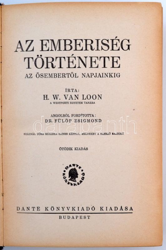 Leírás: H. W. Van Loon: Az emberiség története. Bp., 1931., Dante kiadás. 479 p. Kiadói aranyozott vászonkötésben. A gerinc kissé kopottas, szakadt.