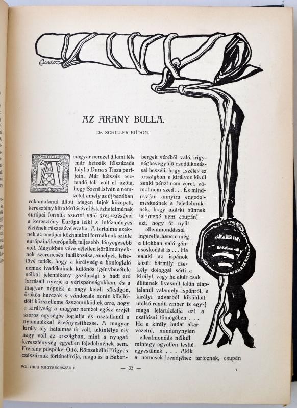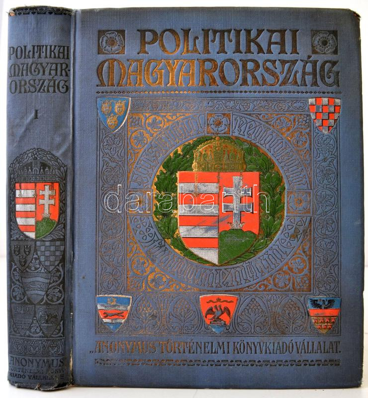 Politikai Magyarország. Főszerkesztője Szász József. I. kötet. Magyarország története az Arany Bullától 1795-ig. A munka vezérszellemét kidomborító tanulmányt írta Dr. Timon Ákos. Kiadói aranyozott, dombornyomott, festett egészvászon-kötésben, kissé kopottas állapotban. A gerinc alsó részén a vászon kissé felszakadt, az előzéklap enyhén sérült.