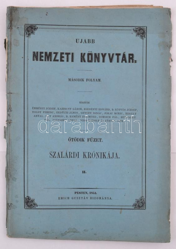 Ujabb Nemzeti Könyvtár. Második folyam. Nyolczadik füzet. Szalárdi krónikája V. Pesten, 1853, Emich Gusztáv. Eredeti kiadói papírkötésben, jobb oldalán ázásnyommal. Felvágatlan.