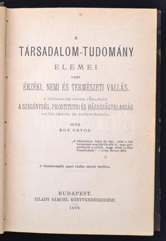 Egy orvos: A társadalom-tudomány elemei vagy érzéki, nemi és természeti vallás. A társadalom három fÅ‘bajának a szegénység, prostitutio és házasságtalanság valódi okáról és gyógyÃtásáról. Budapest, 1879, Zilahy Sámuel. Félvászon kötésben.