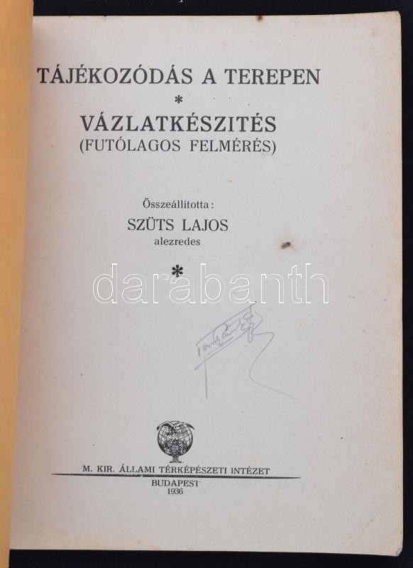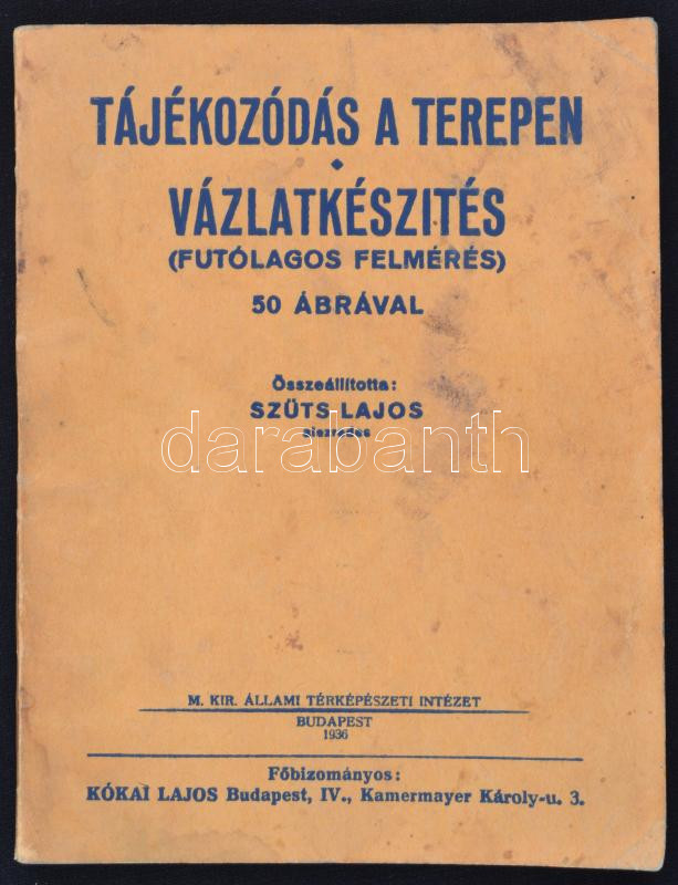 Szüts Lajos (szerk.): Tájékozódás a terepen. Vázlatkészítés (futólagos felmérés) 50 ábrával. Budapest, 1936, M. Kir. Állami Térképészeti Intézet. Kiadói papír kötésben. Kissé foltos fedőborítóval.