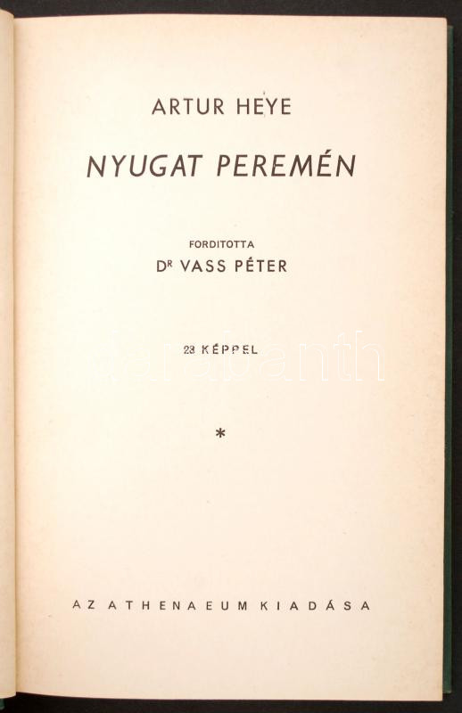 Leírás: Artur Heye: Nyugat peremén. Ismeretlen világok. Bp., é.n., Athenaeum. Kiadói aranyozott egészvászon-kötésben.