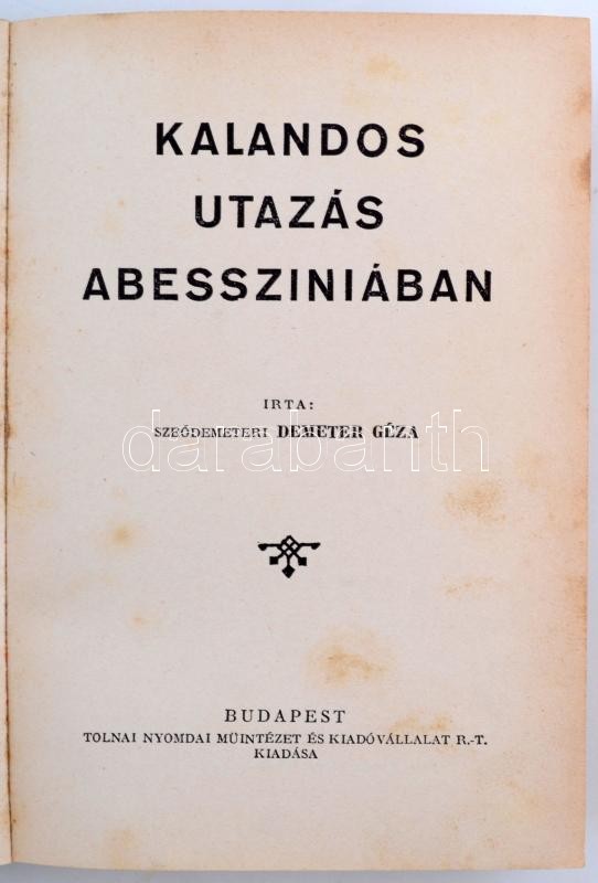 Demeter Géza: Kalandos utazás Abessziniában. Bp., é.n. Tolnai. 316 p. ... https://www.darabanth.com/hu/262-Gyorsarveres/262.0/Konyvek/Konyvek-Utazas-varosok~22/Demeter-Geza-Kalandos-utazas-Abessziniaban-Bp-en-Tolnai-316-p-72-t-Aranyozott-kiadoi-v~II1217517