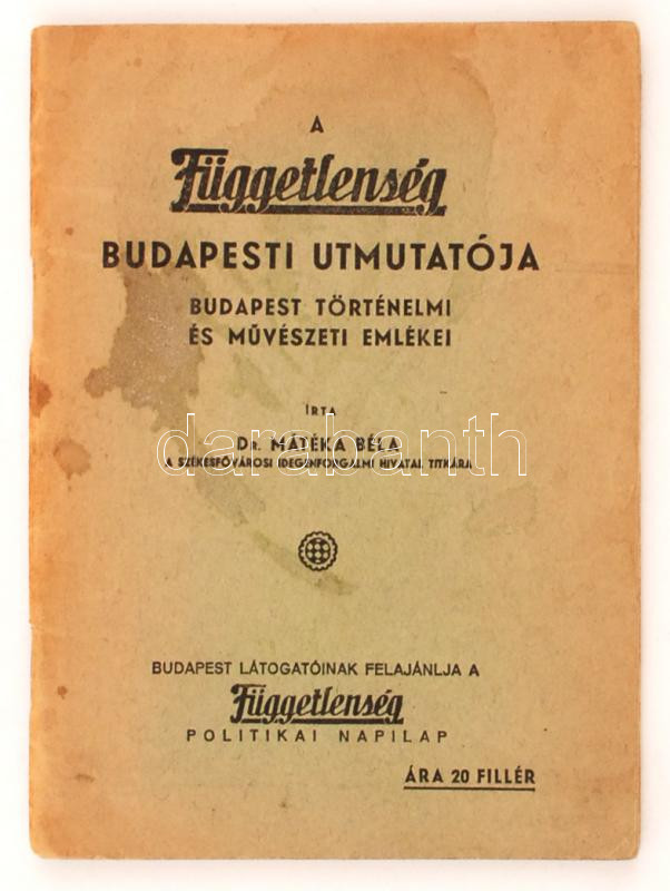 Mátéka Béla: A Függetlenség budapesti útmutatója. Budapest történelmi és művészeti emlékei. Bp., é.n., Függetlenség (Stádium). 44 p. Kiadói papírkötésben. A borító kissé foltos.
