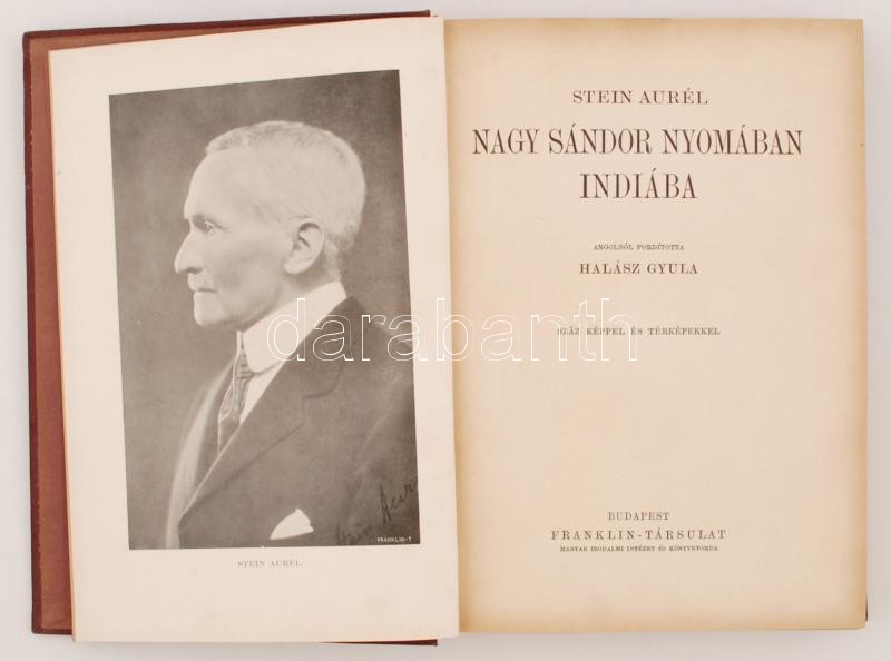 Stein Aurél: Nagy Sándor nyomában Indiába. Angolból fordította Halász Gyula. 100 képpel és térképpel. Bp., é.n., Franklin-Társulat. Magyar Földrajzi Társaság Könyvtára. Kiadói díszes, aranyozott, egészvászon kötésben, jó állapotban.