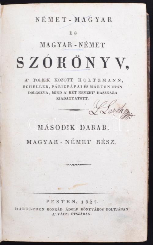 Leírás: Deutsch-Ungarisches und Ungarisch-Deutsches Wörterbuch. 2. Band: Ungarisch-Deutscher Theil. Német-magyar és magyar-német szókönyv. 2. köt.: Magyar-német rész. Pest, 1827, Hartleben Konrád Adolf. Díszes gerincű, kopott bőrkötésben, egyébként jó állapotban.