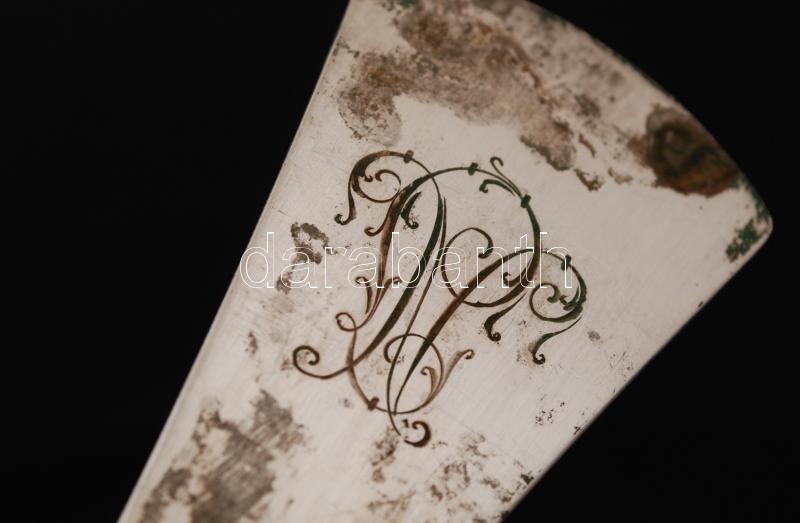 Leírás: Ezüst (Ag.) merőkanál, jelzett, mesterjeggyel, foltos, h:31 cm, nettó:211 g