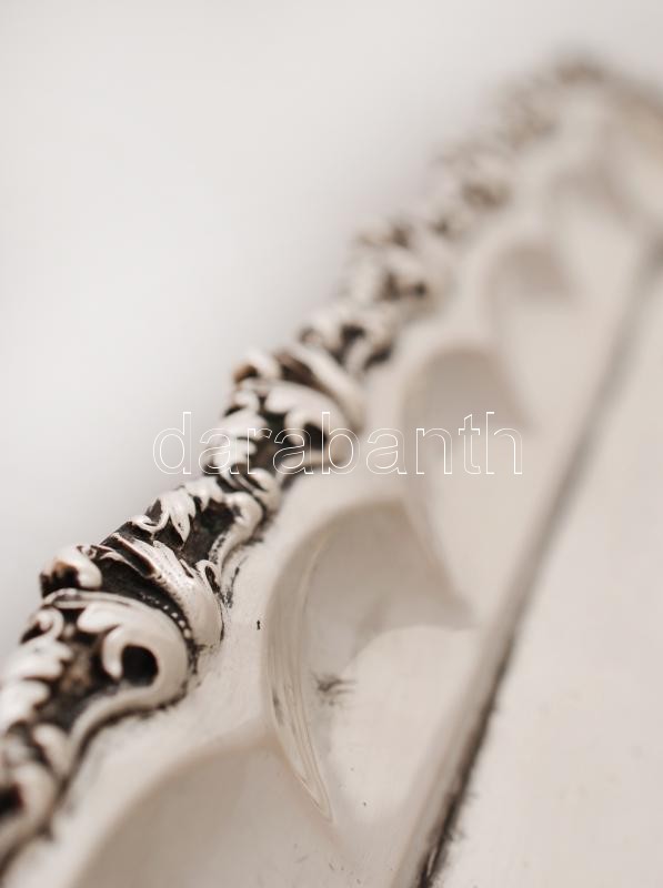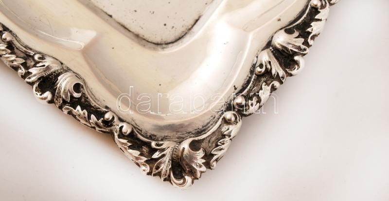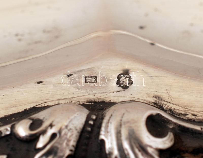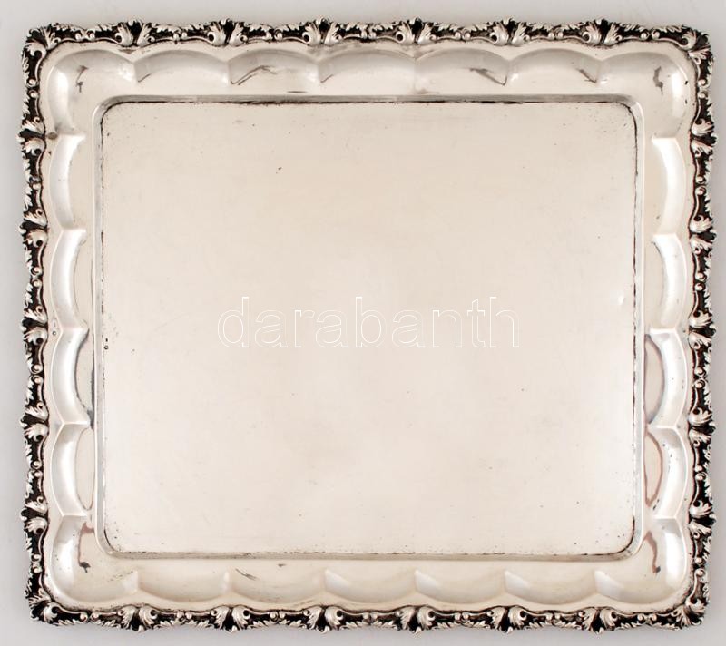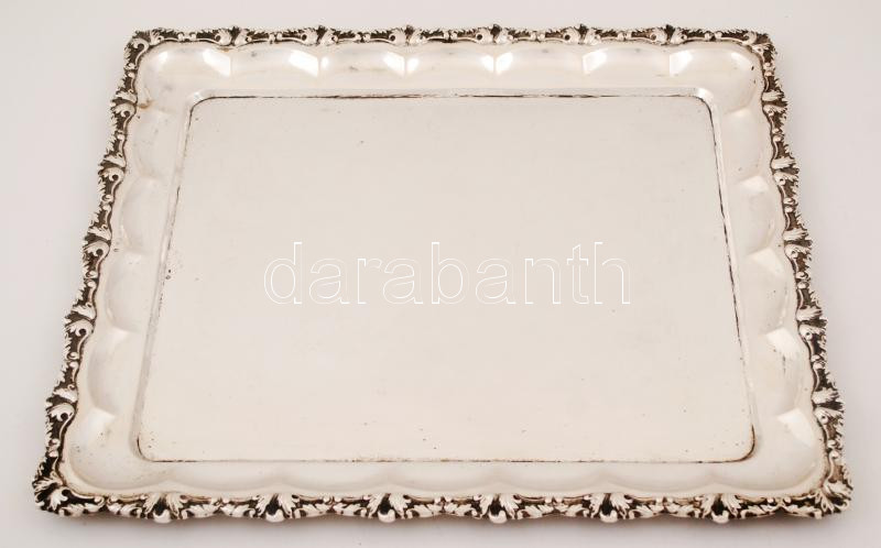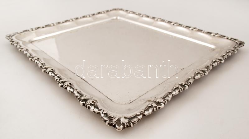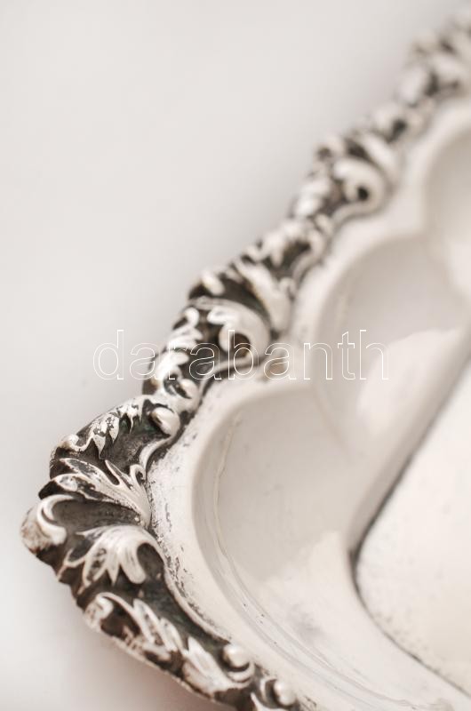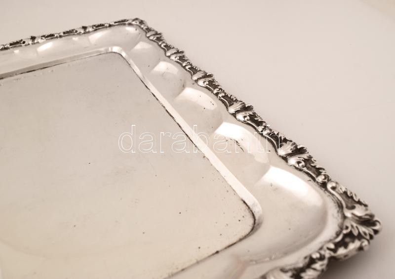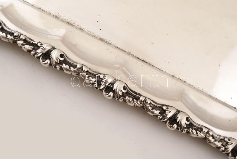 Leírás: Ezüst (Ag.) tálca, díszes peremmel, jelzett, mesterjeggyel (F.F.), nettó:1580 g, 37×42 cm