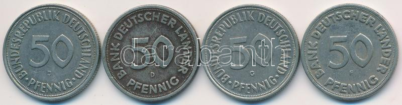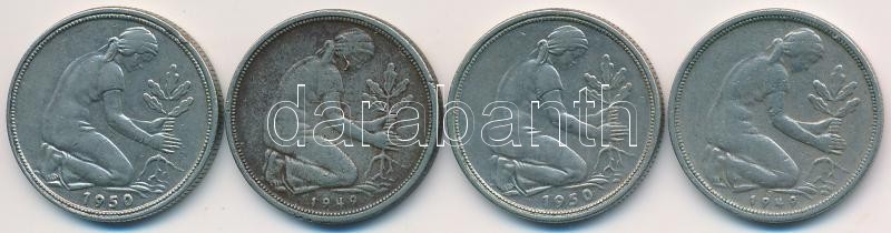 Leírás: NSZK 1949D 50pf Cu-Ni + 1949F 50pf Cu-Ni + 1950G 50pf Cu-Ni + 1950J 50pf Cu-Ni T:2,2- kis ü.