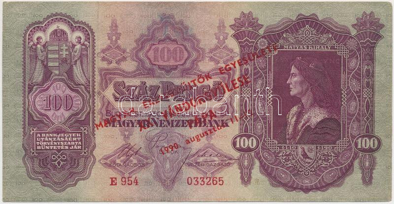 Leírás: 1930. 100P piros "Magyar Éremgyűjtők Egyesülete XX. Vándorgyűlése Pápa 1990. augusztus 11-12." felülbélyegzéssel T:III