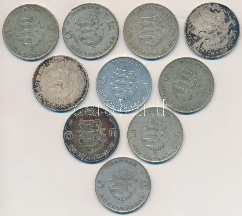 1947. 5Ft Ag "Kossuth" (10x) T:2-,3 https://www.darabanth.com/hu/262-Gyorsarveres/262.0/Numizmatika/Magyar-es-magyar-verdejelu-fem-es-ezustpenzek~200009/1947-5Ft-Ag-Kossuth-10x-T2-3~II1304495