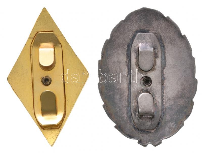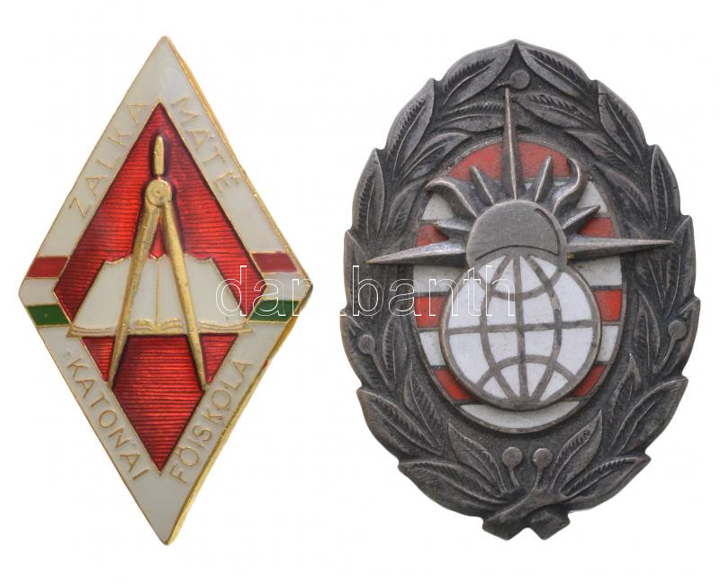 Leírás: ~1970-80. "Zalka Máté Katonai Főiskola" zománcozott jelvény körző motívummal (27,5x46mm) + "Zrínyi Miklós Katonai Akadémia" zománcozott fém jelvény (46,5x33mm) T:1-,2