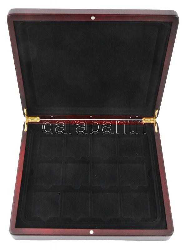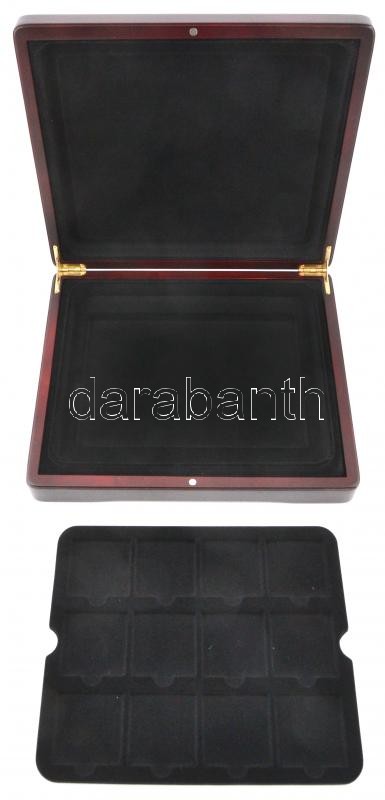 Exkluzív mahagóni fa érmetartó kazetta bársonybéléssel, 12db nagyobb férőhelyet tartalmazó kivehető tálcával, új, használatlan állapotban, eredeti bontott kartoncsomagolásban